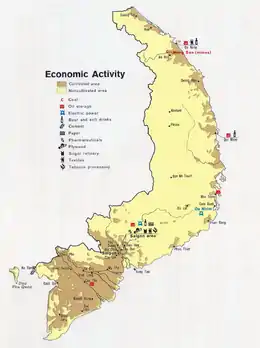 South Vietnam's industry suffered from the departure of foreign troops in the early 1970s, which resulted in significantly less demand. Industrial output shrank by 5% in 1972 and by over 20% in 1973 and 1974.[9] By 1973 food processing was by far the largest industry in terms of output (almost half of the total industrial output of 448 billion dong), followed by textiles (around 1/5 of total output, but the largest employer with 32,489 out of 111,964 workers) and chemicals (1/10) (in terms of capital, electricity was the largest industry).[10]