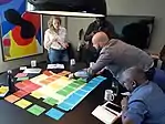 ![]() ![]() ![]() ![]() ![]() From top, A panel from the frescoes in the Assembly Room, Mutual Building in Cape Town, painted by Le Roux Smith in 1942. The fresco illustrates the importance of agriculture and shipping to the economy of the Western Cape in the early half of the 20th century. Left, agricultural workers picking grapes in a Western Cape vineyard. Right, a strategy workshop in a Cape Town office. Bottom left, recently galvanised pipes being finished in a Cape Town factory. Bottom right, cheeses production in Stanford. | |