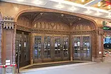 The outer lobby is "L"-shaped and has Gothic design details.[26] As in the vestibule, the outer lobby's marble floor has a rhombus pattern, while the walls have marble baseboards and cast-stone panels.[27] The north and south walls are each divided into three bays, with pairs of piers projecting from either wall. The center bay of the south wall has a three-sided ticket booth, while the westernmost bay on the south wall leads into the inner lobby of the auditorium.[28] The ticket booth projects outward and contains cusped arches with windows, surrounds with Gothic details, and finials.[14] The north wall has cast-iron radiator grilles as well. The west wall contains metal double doors with Gothic tracery, which lead to a service alley, while the east wall contains doors from the entrance vestibule.[27] The ceiling contains transverse ribs, which rise from columns along the north and south walls, dividing the ceiling into coffers. Within each coffer, there are moldings with foliate decoration, as well as rosette bosses.[29]