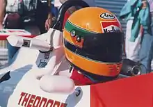 Irvine made his Formula One debut at the Japanese Grand Prix, partnering Rubens Barrichello at the Jordan Grand Prix team. He made an immediate impact, not only by scoring a point with sixth place, but by unlapping himself against race leader, and subsequent winner, Ayrton Senna. After the race, Senna, angry at what he perceived to be "unprofessional" driving, approached Irvine in the Jordan hospitality unit, and following an altercation, threw a punch at Irvine, for which he received a suspended two-race ban.[10] Irvine retired from the final race in Australia with accident damage.[11] After two races, Irvine finished 22nd in the Drivers' Championship with his sole point.[12]