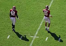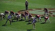 In the 2011 season opener against Kent State, Lacy contributed 134 yards of offense, which were 76 receiving yards on three catches and 58 rushing yards on eight carries (an average of 7.3 yards per rushing carry).[25] His 48-yard gain on a screen pass was the longest passing play of the game. Asked in a post-game press conference if he had hit the "Circle Button" a few times in the game, Lacy joked, "Yeah, I did a few spin moves."[26] The Birmingham News wrote that Lacy "ran more impressively" against Kent State than the Crimson Tide's No. 1 running back, Trent Richardson.[27] Another commentator led his coverage of the Kent State game with the headline, "Lacy, not Richardson, has look of Heisman-caliber RB in game one."[28] After the game, head coach Nick Saban noted, "Eddie's a fast guy, an explosive guy."[28] Photographs of Lacy hurdling over Kent State defensive back Calvin Tiggle were published in news outlets across the United States and in Europe,[29][30][31] with one such image being chosen by Yahoo Sports as its lead "Photo of the Day."[32]