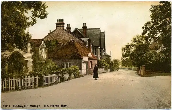 By 1858 Eddington and Underdown were separate districts of Herne parish. In Eddington, Edward Collard was a farmer, William Evans was the surgeon in Herne Street, Eddington, William Johncock was the blacksmith, and Thomas Taylor was running the Blacksmiths' Arms Inn.[25] By 1891, Eddington was still a hamlet in the parish of Herne. It had a post office, a blacksmith, a builder and a maltster. Residences included Prospect House, The Priory and Eddington House.[26]