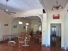 Internally, the front section of the house is used for dining, and several internal walls have been removed, and decorative arched timber details inserted. A section of the central corridor survives, with decorative pressed metal ceiling and cornices, and rooms to either side have pressed metal or boarded ceilings.[1]
