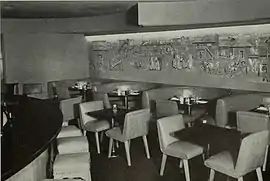 Miller finally received a divorce from Dorothy in 1940. He promptly married Dale Holcomb, a textile designer whom he met while she was working at the Streets of Paris exhibit in the 1933 World's Fair. Their first son, Norman, was born in 1941, and their second son, Ladd, in 1943. The 1940s meant bigger jobs for Edgar. For example, in 1941 Miller created bas-relief sculptures for Northwestern University’s Technological Institute and he again worked with Andrew Rebori on the Dr. Philip Weintraub House. He made a history of brewing beer, in fresco, on the walls of the Pabst Brewing Company’s taproom, the Sternewirt, in 1943. Around this time he created the Tower Court Collection of wallpaper designs for Bassett and Vollum. In the middle 40s he was commissioned to create a history of eating mural for New York's Pierre Hotel. In Washington D.C., he designed murals and bas-relief sculptures for the Statler Hotel, now the Capital Hilton.[1]