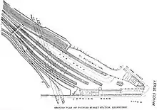 By 1870, with increasing traffic, it was decided to build a new station slightly further north, still on Lothian Road but nearer Princes Street.[2] Renamed Princes Street Station, it was opened in May 1870. It was built of timber with a pitched, slated roof. In June 1890, the building, which had been called the "wooden shanty", suffered a major blaze.
