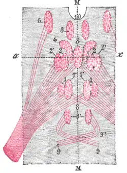 ![]() Figure showing the different groups of cells, which constitute, according to Perlia, the nucleus of origin of the oculomotor nerve. 1. Posterior dorsal nucleus. 1’. Posterior ventral nucleus. 2. Anterior dorsal nucleus. 2’. Anterior ventral nucleus. 3. Central nucleus. 4. Nucleus of Edinger and Westphal. 5. Antero-internal nucleus. 6. Antero-external nucleus. 8. Crossed fibers. 9. Trochlear nerve, with 9’, its nucleus of origin, and 9", its decussation. 10. Third ventricle. M, M. Median line. | |