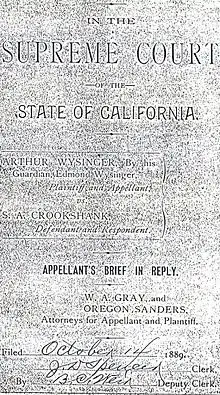 In 1862, Visalia was a community deeply divided by the American Civil War (1861–1865) and many sided with the South. Despite the turmoil, Wysinger stayed in the community. Wysinger, a self-educated man, worked as a laborer and part-time preacher. He stressed the importance of education for his children. He tried to admit his son Arthur to a regular public school but was refused, resulting in him entering a suit against the county school board of education in the Supreme Court of the State California in October 1888. On March 1, 1890, the California Supreme Court, in Wysinger vs. Crookshank reversed a lower court decision and ordered that 12-year-old Arthur Wysinger be admitted to Visalia's regular school system.[1]