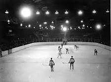 The arena was built at the fairgrounds in order to be away from the city, thus allowing it to also be used as a livestock pavilion, alongside the stables and horse race track. The opening ceremonies were held on Christmas Day 1913, exactly 19 years after Edmonton's first hockey game, featuring a hockey game between two Stanley Cup finalists, the Edmonton Eskimos and the Edmonton Dominions, which over 2,000 fans attended.[3] Their previous arena, Thistle Rink, had just burnt down that year.[1] The Dominion's forward Russell "Barney" Stanley would become a member of the Hockey Hall of Fame, and the arena would be home to other Stanley Cup finalist teams, Memorial Cup teams, and three Memorial Cups. It was the only home of the Edmonton Flyers (1939–51).