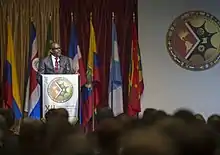 ![]() Dillon speaking as president of the XII Conference of Defense Ministers of the Americas in 2016 | |
