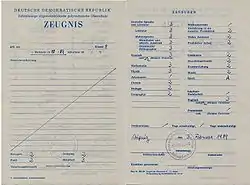 Since 1951 the learning of the Russian language as the foreign language was obligatory, because of the leading role of the Soviet Union in the Eastern bloc. Also available were English and French, but only as an additional elective foreign language (Universities required two foreign languages). The Russian lessons focused on the Cyrillic script, the writing, the reading and the grammar of the Russian language. To be able to have a substantial conversation was not an aim, but to be able to use professional and technical Russian literature. The speaking skills should reach a level of sufficient fluency to have a small conversation with a local. There were only few opportunities for student exchanges. Appreciated by parents were the so-called head marks (Kopfnoten) which assessed behavior, industriousness, order, and cooperation. These were combined with a short teacher's essay about the student's character, success or progress, advice for future improvements - here and there from a socialistic point of view.