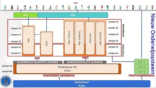 The education in Suriname was initially set up in analogy to the Dutch education system. In terms of structure, the education system is now a mixture of school types that were common in the Netherlands before, during and after the Mammoetwet.