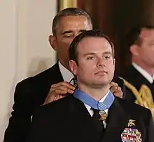 In December 2014, General Martin Dempsey "strongly recommended" Byers for the Medal of Honor.[13] On February 29, 2016, President Barack Obama presented the Medal of Honor to Byers during a ceremony at the White House.[14] Byers is the sixth SEAL to receive the Medal of Honor.[3] Byers was assigned to Naval Special Warfare Development Group, also known as SEAL Team Six, when he was presented the Medal of Honor.[15] Byers is the first member of the unit to receive the Medal of Honor for an action as a unit member.[10][16] The next month, Byers requested to return to his SEAL team.[17]
