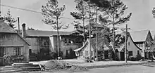 Kuster had Lee E. Gottfried build the Carmel Weavers Studio for his wife Ruth in September 1922 (now Cottage of Sweets). The studio was in front of the theatre. It housed Ruth and two fellow local weavers. They made and sold woven scarves, hats, handbags, blankets, and other clothing articles.[13][14] In July 1923, the studio was rolled down on logs from Dolores Street to the Court of the Golden Bough on Ocean Avenue. In August 1923, Gottfried expanded the studio with a design by Kuster that included a brick fireplace and a ticket booth for the theatre. At the same time, construction of Kuster's Seven Arts Shop was being planned as another shop for the courtyard. Kuster would have Gottfried build Sade's on the northeast side of the court in 1925.[8][15][16] Kuster also designed and had Michael J. Murphy build the Seven Arts Shop in the Tudor Storybook style in 1923 next to the Golden Bough theater.