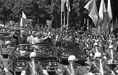 In 1979, Poland's ruling communists reluctantly allowed Pope John Paul II to make his first papal visit to Poland (2–10 June), despite Soviet advice to the contrary. Gierek, who had previously met Pope Paul VI at the Vatican, talked with the Pope on the occasion of his visit.[21]