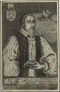 Parry was the son of Rhys Parry, a merchant[1] of Newry, County Down. The name of his mother is disputed. The 'Pedigree of Parry of Newry, Co. Down and City of Dublin 1560–1735', pp. 86–88, in MS. 173, Genealogical Office, Dublin states his mother was named Frances Price. The will of his father also refers to My wife Frances Parrie.[2] However the Cheshire Sheaf issue of September 1883, page 72, states his mother was Mary Darby. He was born c. 1599 in Madyn Dyswy, Amlwch, Anglesey, Wales. His siblings were Arthur, Grace and Magdalen. Bishop Parry was educated in Newry where his father was chaplain to Sir Nicholas Bagenal, (It seems improbable that Rhys Parry was chaplain to Nicholas Bagenal, as Nicholas died in 1591[3] when Rhys was about 20 years old. It looks as if Rhys moved to Ireland shortly after the birth of Edward, as Edward's siblings were born in Newry, not Anglesey.[4] At that time Arthur Bagenal, Nicholas Bagenals grandson received a patent of James II in 1637 confirming a grant and mortgages, wherein he held a Newry monastic building at the corner of Castle Street which is referred to in error as a Castle by some authors, this was formerly Abbot Crellys Cistercian built House Circa 1144 (see Crelly, Bagenal 1588 patent). Newry had one Bagenal Castle at all dates in the Bagenal reign in the town.[5]) In 1616 he enrolled as a student of Trinity College, Dublin[6] where he graduated in Easter 1620 as a B.A. He obtained his master's degree there in 1623 and a fellowship in 1624. In Easter 1630 he graduated as a Doctor of Divinity and later became Pro Vice-Chancellor of the college.