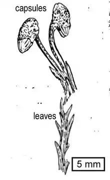 Edwardisphyton has narrow acutely pointed leaves and recurved capsules. Spores are small and verrucate.