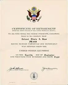 In 1963, Doss was appointed deputy inspector general and inspector general of the United States Air Forces in Europe (USAFE) headquarters.[33] He served as head of the command liaison agency to the government of France at Paris from 1964 until 1966, and then deputy commander of the 25th Air Division at McChord Air Force Base until he retired from the Air Force in 1968.