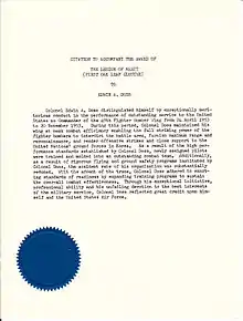 | 5. | Aug 1943 – Sep 1945 | Group commander, 35th Fighter Group, Port Moresby, New Guinea, Okinawa. |
