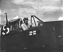 Flying the Grumman F6F Hellcat, he shot down four Japanese aircraft during the squadron's combat tour, and hit a Japanese aircraft carrier with a bomb, during the Battle of Leyte Gulf.[3]