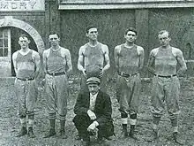 Sweetland also served as trainer of Ohio State's athletic teams and coach of the Buckeye's track and field team starting in 1905[47] and again in 1906.[48] He was the first "Trainer" at Ohio State University, filling a role approved by the Athletic Board in January 1904 [43] and which he accepted in December 1904.[47] While track coach, with a victory over Oberlin in a dual meet by a score of 52–33 the Buckeyes won the state championship for 1905.[49] In the spring of 1906 he was accused of using "improper inducements" in securing players and was investigated by the University's Athletic Board who publicly exonerated him.[50]
