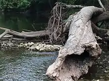 Originating as an "ice-marginal channel" at the edge of the retreating Saginaw Lobe of the Wisconsin Glacier, the Eel River was later buried by the glacier's advancing Erie Lobe.[3] As the Erie Lobe retreated, the Eel formed a single stream with what is now upper Cedar Creek in DeKalb and Allen counties. The ancestral Eel River was also fed by glacial meltwater surging under the ice from the southeast through a "tunnel valley" known today as Cedar Creek Canyon.[4] Blockage of the Eel's channel by outwash from the canyon and a decline in the volume of meltwater forced the upper Eel to change course into the canyon, creating today's Cedar Creek.[4] This is a classic example of stream piracy that shifted almost 175,000 acres (710 km2) of land from the Eel-Wabash watershed to that of the St. Joseph-Maumee.[4][5]