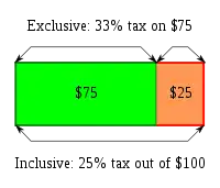 The income tax is taken "off the top", so the individual is left with $80 in after-tax money. Some tax laws impose taxes on a tax base equal to the pre-tax portion of a good's price. Unlike the income tax example above, these taxes do not include actual taxes owed as part of the base. A good priced at $80 with a 25% exclusive sales tax rate yields $20 in taxes owed. Since the sales tax is added "on the top", the individual pays $20 of tax on $80 of pre-tax goods for a total cost of $100. In either case, the tax base of $100 can be treated as two parts—$80 of after-tax spending money and $20 of taxes owed. A 25% exclusive tax rate approximates a 20% inclusive tax rate after adjustment.[10] By including taxes owed in the tax base, an exclusive tax rate can be directly compared to an inclusive tax rate.