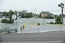On the day of landfall, police were stopping travelers at La Marque, 4 miles (6 km) north of Galveston, and making them exit the highway.[32] Interstate 45 at La Marque had been closed because boats and parts of wrecked piers were strewn throughout floodwaters blocking the road.[32]