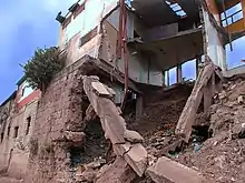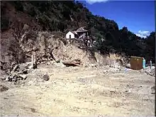 High water levels along the Choluteca River affected the capital, Tegucigalpa,[6] reaching levels 10 m (33 ft) above their banks.[5] Mitch largely destroyed the center of the city, including many residential buildings along river banks.[7] The floods damaged about one-third of buildings, including some more than 350 years old.[8] The storm destroyed the primary water mains in Tegucigalpa and neighboring Comayagüela, and 23 km (14 mi) of water piping had to be repaired.[7] In central Tegucigalpa, there was a large earthflow along Cerro El Berrinche mountain that weighed 6,000,000 m3 (210,000,000 cu ft). This landslide, the largest generated by Mitch in the country, destroyed the Colonia Soto section and damaged portions of two other neighborhoods.[9] It carried debris, trees, and rocks, forming a temporary dam along the Choluteca River laden with sewage.[5][9] Because the landslide was slow-moving, officials were able to evacuate before the river was stopped due to the temporary dam. Another smaller landslide destroyed several houses in the Colonia El Reparto section of the capital, although it was also slow-moving, and the residents were able to evacuate. Other landslides destroyed over 20 houses along the rivers in the city due to erosion along river banks.[9]