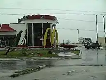 Across Mexico, Wilma killed eight people – seven in Quintana Roo, and one in Yucatán.[19] In Playa del Carmen, two people died and another seven were injured when a gas tank exploded.[20] One person died in Yucatán after being struck by a fallen tree branch.[21] Three people died on Cozumel.[22] One person in Cancún was electrocuted while preparing for the storm.[5] Another person died in Cancún because of glass from a broken window.[23] Throughout Mexico, Wilma's damage was estimated at $4.8 billion (MXN, US$442 million). The hurricane caused an additional $13.9 billion (US$1.3 billion) in lost economic output and earnings, 95% of which was related to lost tourism revenue.[3] Wilma damaged 28,980 houses along its path.[3] Concrete buildings fared better than those constructed out of local materials.[24] The storm damaged about 10,000 power lines, causing power outages for 300,000 people.[25] Damage to transmission towers and antennas disrupted communications networks.[3] The cost to repair the electrical infrastructure was $397.5 million (MXN, US$36.6 million), mostly in Quintana Roo.[12][24][9] Across the region, Wilma damaged 473 schools,[3] including about 60% of such institutions in Quintana Roo. Damage to schools accounted for $156 million (MXN, US$14.4 million) of the hurricane's cost. Hospitals, particularly in Cancún and Cozumel, sustained damage to medical equipment.[12] High winds blew down traffic signals, signs, and fences.[3]