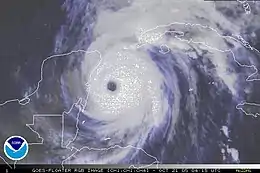 ![]() Satellite image of Hurricane Wilma approaching the Yucatán Peninsula on October 21 | |