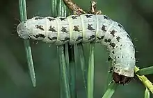 The larvae feed on Kunzia tridentata, Abies grandis, Tsuga heterophylla and Pseudotsuga species, including Pseudotsuga menziesii.