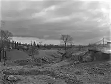 The eastern segment through Scarborough was known as Highway 5A between 1937 and 1953; this number also appeared on St. Clair Avenue West until 1952 when the Toronto Bypass, (the precursor to Highway 401), opened between Weston and Highway 11 (Yonge Street). The two pieces of "Highway 5A" were never connected. In 1953, what remained was renumbered as Highway 109; a year later, the road was removed from the provincial highway system. Because of its time as a provincial highway, the road through Scarborough was widened considerably. A right of way was also acquired to bridge the gap in Eglinton. Until the mid-1950s, Eglinton did not cross either of the valleys of the Don River. The road ended at Brentcliffe Road (unassigned path beyond Laird towards Brentcliffe and the dump was once site of hangar for Leaside Aerodrome) and resumed at Victoria Park Avenue (then known as Dawes Road). This break resulted in a bypassed eastern stub at Bermondsey Road signed as Old Eglinton Avenue. The Department of Highways relinquished control of Highway 109 to the newly formed Metro government. Metro built the new section of Eglinton Avenue, first between Dawes Road and Don Mills Road in 1955, and later between Don Mills Road and Leaside in 1956.[2]