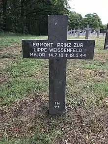 After a one-month hospital stay, Prinz zur Lippe-Weißenfeld was promoted to Major and made Geschwaderkommodore of Nachtjagdgeschwader 5 (NJG 5—5th Night Fighter Wing) on 20 February 1944.[21] He and his crew, Oberfeldwebel Josef Renette and Unteroffizier Kurt Röber, were killed in a flying accident on 12 March 1944 on a routine flight from Parchim to Athies-sous-Laon. Above Belgium, they seem to have encountered a bad weather zone with low clouds and a dense snowstorm and it was assumed that the aircraft hit the high Ardennes ground after being forced to fly lower because of ice forming on the wings.[22] The exact circumstances of this flight may never be known, the Bf 110 G-4 C9+CD (Werknummer 720 010—factory number) crashed into the Ardennes mountains near St. Hubert where the completely burned-out wreck was found the following day.[23] The funeral service was held in the city church of Linz on 15 March 1944.[24] Prinz Egmont zur Lippe-Weißenfeld and Prinz Heinrich zu Sayn-Wittgenstein are buried side by side at Ysselsteyn in the Netherlands.[25]