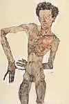 In 1910, Schiele began experimenting with nudes and within a year a definitive style featuring emaciated, sickly-coloured figures, often with strong sexual overtones. Schiele also began painting and drawing children.[8] Schiele's self portrait, Kneeling Nude with Raised Hands (1910), is considered among the most significant nude art pieces made during the 20th century. Schiele's radical and developed approach towards the naked human form challenged both scholars and progressives alike. This unconventional piece and style went against strict academia and created a sexual uproar with its contorted lines and heavy display of figurative expression. At the time, many found the explicitness of his works disturbing.