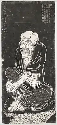 Because no historical records detailing what the Luohans looked like existed, there were no distinguishing features to tell the Luohans apart in early Chinese depictions.[5] The first portraits of the 16 Luohans were painted by the monk Guanxiu in 891 AD, who at the time was residing in Chengdu. Legend has it that the 16 Luohans knew of Guanxiu's expert calligraphy and painting skills, so they appeared to the monk in a dream to make a request that he paint their portraits.[6] The paintings depicted them as foreigners having bushy eyebrows, large eyes, hanging cheeks and high noses. They were seated in landscapes, leaning against pine trees and stones. An additional theme in these paintings was that they were portrayed as being unkempt and "eccentric," which emphasizes that they were vagabonds and beggars who have left all worldly desires behind. When Guanxiu was asked how he came up with the depictions, he answered: "It was in a dream that I saw these Gods and Buddhas. After I woke up, I painted what I saw in the dream. So, I guess I can refer to these Luohans as 'Luohans in a dream'." These portraits painted by Guanxiu have become the definitive images for the 18 Luohans in Chinese Buddhist iconography, although in modern depictions they bear more Sinitic features and at the same time have lost their exaggerated foreign features in exchange for more exaggerated expressions. The paintings were donated by Guanxiu to the Shengyin Temple in Qiantang (present day Hangzhou) where they are preserved with great care and ceremonious respect.[7] Many prominent artists such as Wu Bin and Ding Guanpeng would later try to faithfully imitate the original paintings.