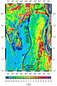 The Eighty Five East Ridge or 85°E Ridge is a near-linear, aseismic, age-progressive ridge in the northeastern Indian Ocean. It is named for its near-parallel strike along the 85th meridian.[1] It is one of two major aseismic ridges in the Bay of Bengal, the other being the Ninety East Ridge.[2] The feature extends from the Mahanadi Basin in the north, off the northeastern coast of India, shifts westwards by about 250 km around 5°N, southeast of Sri Lanka and continues south to the Afanasy Nikitin Seamount in the Central Indian Basin.[3]