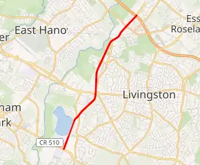 The Eisenhower Parkway begins at an intersection with CR 510 in Livingston, Essex County, heading north as a four-lane divided highway. The road passes the Livingston Mall before becoming undivided and passing to the east of the Commonwealth Water Company Reservoir Number Three. Upon turning northeast, the roadway becomes divided again as it crosses CR 607 and passes through forests. The Eisenhower Parkway intersects Route 10 at the modified Livingston Circle, at which point the road passes businesses as CR 661 branches to the east of the road. The highway heads north-northeast through more forested areas with occasional commercial development, meeting CR 661 again prior to crossing into Roseland. Here, the road crosses the Morristown and Erie Railway's Whippany Line and passes businesses, crossing CR 611 prior to coming to a cloverleaf interchange with I-280. At this interchange, the CR 609 designation ends and the Eisenhower Parkway continues northeast to a dead end a short distance later.[1][2]