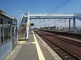The station has two opposed side platforms, with platform 1 adjacent to the station building. The platforms are connected by an uncovered footbridge. Three rail lines pass between the platforms, with the middle, non-electrified line used for freight traffic. The station is staffed.