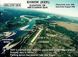 Ekwok Airport (IATA: KEK, FAA LID: KEK) is a state-owned public-use airport serving Ekwok,[1] a city in the Dillingham Census Area of the U.S. state of Alaska. Scheduled airline service to Merrill Field in Anchorage, AK is provided by Dena'ina air.[3]