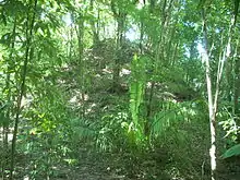 Some of the major architecture of the site core is covered by secondary forest, including some large trees, while much of the city's remains lie within the modern village, including mounds of various sizes.[9] Some mounds were destroyed in order to build the modern streets, in other cases the mounds were robbed of stone that was reused in modern construction.[9] There are also instances where modern houses have been built on top of ancient mound platforms.[9] Modern houses had previously also occupied the outskirts of the acropolis but were relocated during the Guatemalan Civil War in the late 20th century due to guerrilla activity.[10]