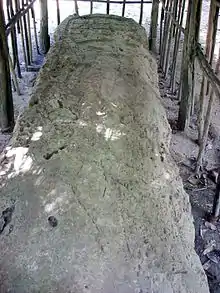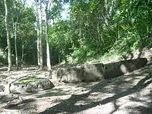 East Plaza Structure 2 is also on the east side of the plaza.[20] It is a rectangular platform measuring 17 by 10 metres (56 by 33 ft) and facing westwards onto the plaza itself.[75] A stairway climbs the west side of the building. It measures 12 by 1.2 metres (39.4 by 3.9 ft).[75] The platform supports a bench measuring 12 by 3 metres (39.4 by 9.8 ft).[75] The broken remains of Stela 6 are scattered in front of the structure.[75] Relatively few ceramic remains were found associated with this structure. Those that were have been dated to the Terminal Classic, although a pit sunk into the summit uncovered remains dating to the Late Classic at a depth of 1 metre (3.3 ft).[76] Lithic artefacts included a piece of an obsidian knife.[76]