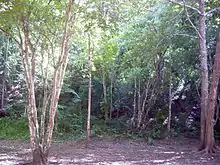 El Chal is located in the municipality of El Chal in the department of Petén in northern Guatemala.[6] El Chal is 40 kilometres (25 mi) south of Flores, the departmental capital.[1] The archaeological site is within the southern area of the village and municipal seat also named El Chal,[5] 600 metres (2,000 ft) to the south of the highway to Flores.[7] The site is situated in the central Petén wet savanna in a well-drained area not subject to seasonal flooding.[5] The local topography is karstic in nature, and includes hills that support some of the city's architecture.[8]