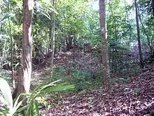 Terrace 1 Structure 2 is on the northeast side of Patio A.[2] It was a single level platform measuring 8 by 5 metres (26 by 16 ft) by 2 metres (6.6 ft) high.[2] It was accessed via a projecting stairway measuring 5 metres (16 ft) wide and protruding 1.5 metres (4.9 ft) from the structure.[2] The five steps each had a tread of 0.25 metres (0.82 ft) and a riser measuring 0.24 metres (0.79 ft).[2] Archaeologists were unable to investigate the summit of Structure 2 due to the large size of the trees growing upon it.[2] The structure clearly shows two construction phases, the first dating to the Late Classic and the second to the Terminal Classic.[2] Finds dating to the Middle Preclassic were recovered from trenches sunk into the patio in front of the structure, consisting of 378 potsherds associated with Burial 265.[2] A Late Classic cache was also found at the base of the stairway, consisting of 2 eccentric obsidian artefacts shaped like centipedes, a flint arrowhead, various pieces of waste flint, and a number of flint blades and obsidian prismatic blades.[43]
