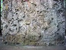 The platform supported a long superstructure facing onto the West Plaza, as evidenced by the bases of its walls.[84] Originally the superstructure consisted of a single, long room but this was later subdivided; another room to the south was probably demolished at the same time.[87] The floor of the superstructure is 11.5 metres (38 ft) above the level of the West Plaza.[84] The walls were 1.1 metres (3.6 ft) thick and the entrance doorway measured 2.5 metres (8.2 ft) wide.[84] This superstructure was divided into five rooms, each measuring 2.9 by 0.5 metres (9.5 by 1.6 ft).[88] These rooms were completely sealed, and in some cases destroyed, by a layer of compact white soil during the Terminal Classic.[88] The rooms were upon a low platform upon the summit and were accessed from the upper section of the basal platform via three steps measuring 22 metres (72 ft) wide, with a tread of 0.25 metres (0.82 ft) and a height of 0.3 metres (0.98 ft).[87] Stucco fragments with traces of pigment indicate that the rooms were once painted.[87]