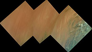 A part of Ed Djouf region viewed from space during the Apollo 9 mission. To the right are rock outcrops in western Mali, and to the left are dunes in eastern Mauritania.