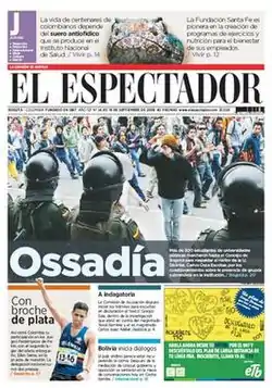 El Espectador (meaning "The Spectator") is a newspaper with national circulation within Colombia, founded by Fidel Cano Gutiérrez on 22 March 1887 in Medellín and published since 1915 in Bogotá. It changed from a daily to a weekly edition in 2001, following a financial crisis, and became a daily again on 11 May 2008,[2][3] a comeback which had been long rumoured,[4][5] in tabloid format (28 x 39.5 cm). From 1997 to 2011 its main shareholder was Julio Mario Santo Domingo.[6]