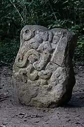 There are a number of "triadic" structures (around 35 structures),[10] consisting of large artificial platforms topped with a set of 3 summit pyramids. The most notable of such structures are three huge complexes; one is nicknamed El Tigre, with height 55 metres (180 ft); another is called La Danta (or Danta) temple. The La Danta temple measures approximately 72 metres (236 ft) tall from the forest floor,[11] and considering its total volume (2,800,000 cubic meters) is one of the largest pyramids in the world.[12] When the large man-made platform that the temple is built upon (some 180,000 square meters) is included in calculations, La Danta is considered by some archeologists to be one of the largest ancient structures in the world.[13] Also the Los Monos complex is very large (48 meters high) although not as well known. Most of the structures were originally faced with cut stone which was then decorated with large stucco masks depicting the deities of Maya mythology. According to Carlos Morales-Aguilar, a Guatemalan archaeologist from Pantheon-Sorbonne University, the city appears to have been planned from its foundation, as alignments have been found between the architectural groups and main temples, which were possibly related to solar alignments.[14] The study reflects an importance of urban planning and sacred spaces since the first settlers.
