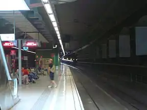 El Prat de Llobregat or El Prat Estació is both a Rodalies de Catalunya and a Barcelona Metro station serving the suburb of El Prat de Llobregat, to the south-west of Barcelona, in Catalonia, Spain. It is on the conventional Madrid–Barcelona railway and is served by all trains on Barcelona commuter rail service lines R2 and R2 Nord, as well as some R2 Sud trains.[4] Some trains on regional line R15 also call at the station.[5] The metro station is on the airport branch of Barcelona Metro line 9 (L9) and is operated by Transports Metropolitans de Barcelona (TMB).