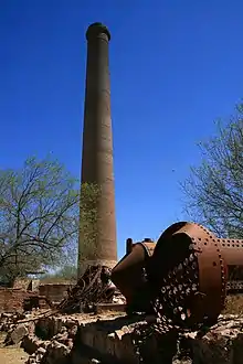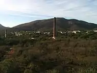 A notable feature of the town is the 47-meter-high[9] smokestack constructed in 1890 for El Progreso Mining Company. It is called "La Ramona", named after Saint Raymond, on whose feast day the project was completed on. The smokestack was once thought to be designed by Gustave Eiffel, though no conclusive evidence of his involvement in the project has been located.[6] After more than 100 years, the smokestack was cracked and damaged and collapse during an earthquake or hurricane was a concern.[6] In 2018, the nonprofits International Community Foundation (ICF) and the Corredor Histórico CAREM, A.C. collaborated to restore La Ramona for an estimated $200,000 USD.[6][10]