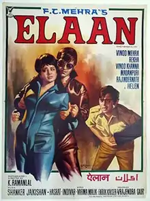 Elaan is a 1971 Bollywood Sci-Fi thriller film directed by K. Ramanlal. The film stars Vinod Mehra, Rekha, Vinod Khanna, and Madan Puri . The rights to this film are owned by Shah Rukh Khan's Red Chillies Entertainment.